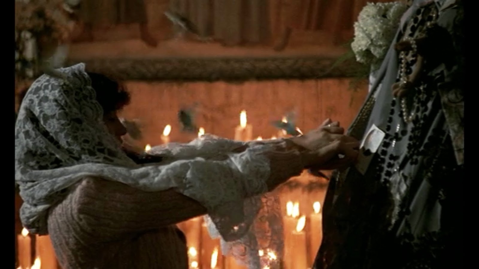 the music begins within a dimly lit room where a ritual is taking place. In a slow procession, a statue is being carried.